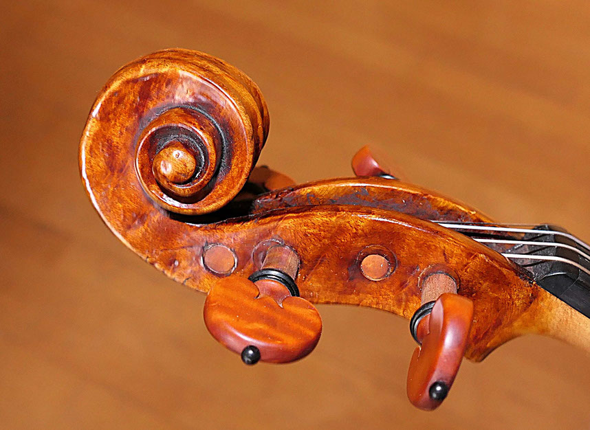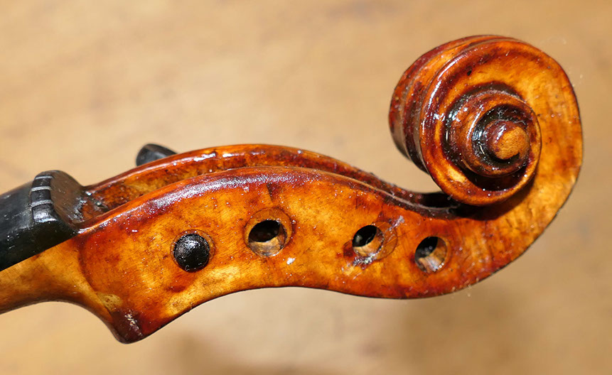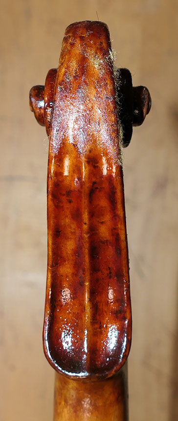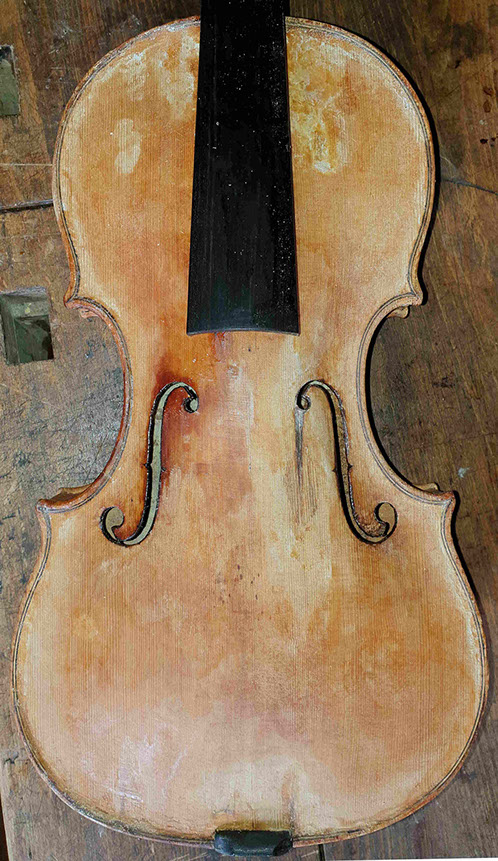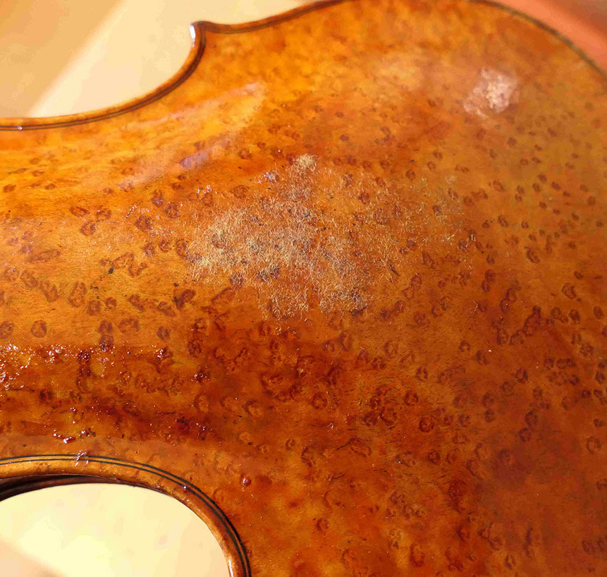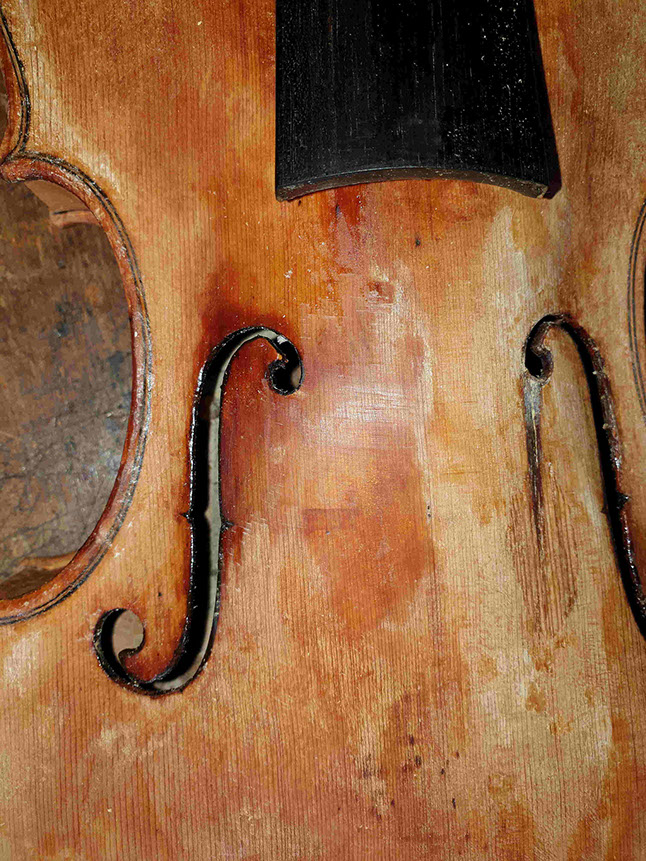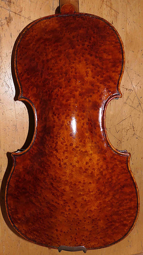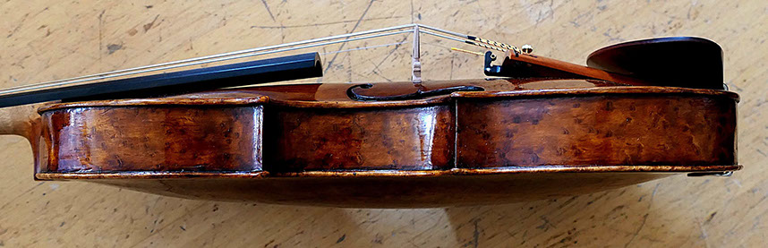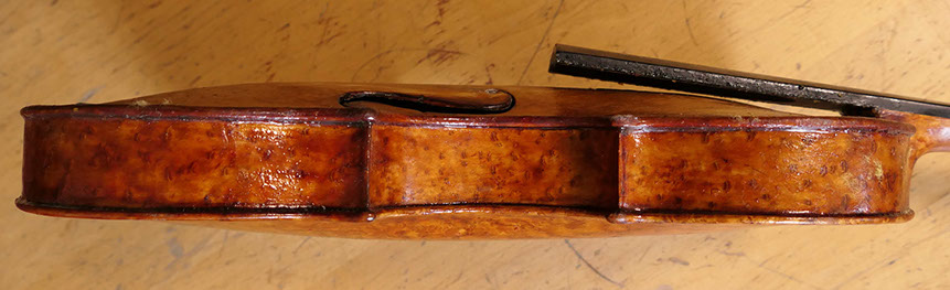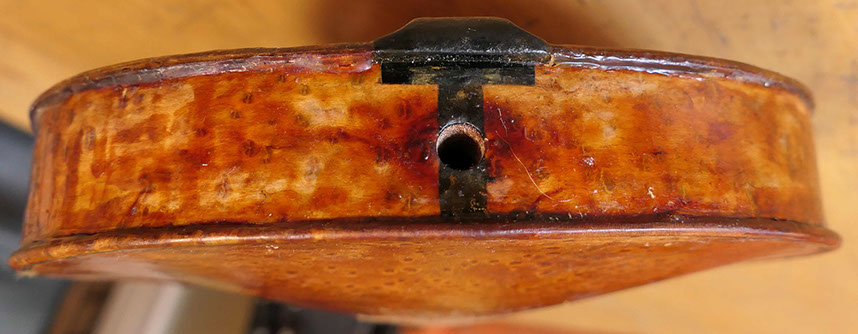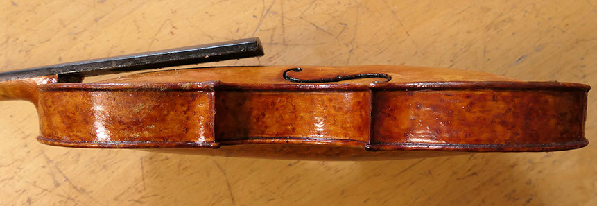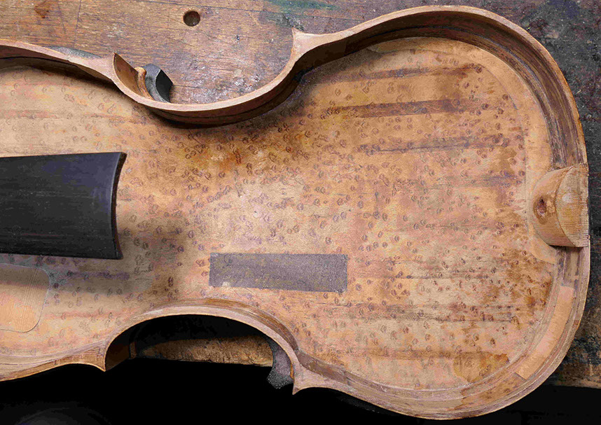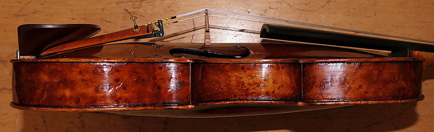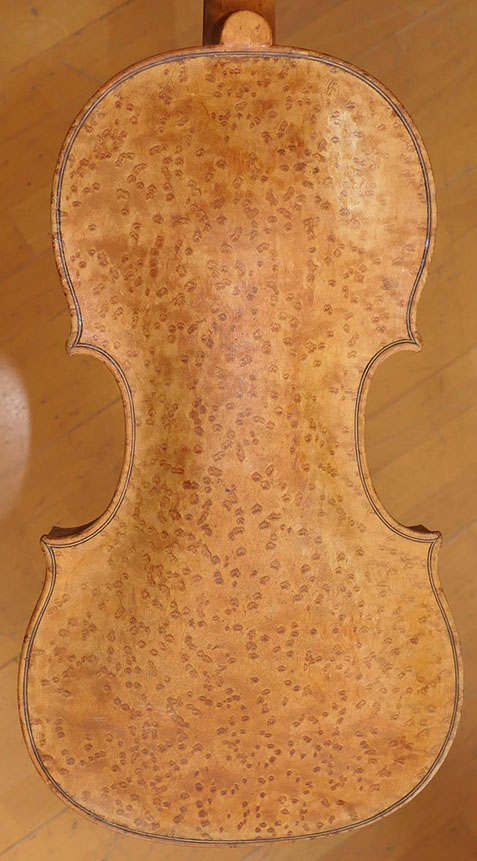 Im Juli 2021 kam eine Dame zu mir in die Werkstatt, um mir eine Geige zu zeigen. Sie erzählte mir, dass sie und Ihre Geschwister vom Vater ca. 60 Instrumente geerbt haben. Ihr Vater sammelte Geigen und reparierte auch autodidaktisch Instrumente. Die Geige, welche mir gezeigt wurde, soll eines seiner wertvollsten Instrumente, eine echte Jacobus Stainer aus Absam sein, welche auch eine Expertise von einem anerkannten Gutachter und Geigenbauer hat. Als der Kasten geöffnet wurde, traute ich meinen Augen kaum, da die Geige keinen originalen Lack mehr hatte und mit einem sehr dicken immer noch klebrigen Lack überzogen war. Ich konnte es kaum glauben, dass das eine echte Stainer Geige sein sollte, aber viele einzelne Dinge deuteten darauf hin. Nachdem ich Bilder in Büchern verglichen hatte und im Internet recherchierte, hatte ich eine andere Geige von Stainer aus dem Jahr 1665 gefunden, welche 2016 versteigert wurde. Bei beiden Instrumenten verwendete Stainer für den Boden und die Zargen Vogelaugenahorn und zwar exakt aus dem gleichen Stamm. Es müssen zwei Bretter gewesen sein, die exakt übereinander gewachsen sind. Man kann dies an der identischen Maserung erkennen.