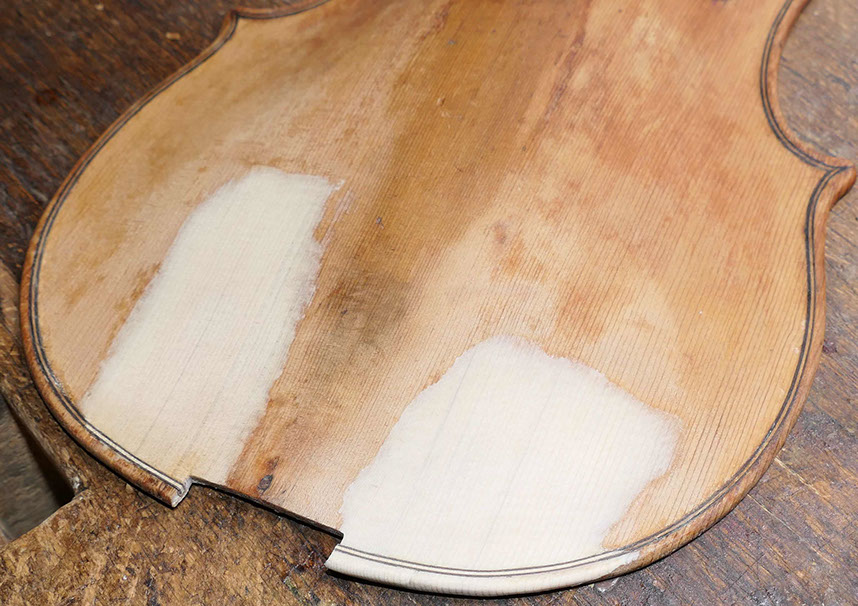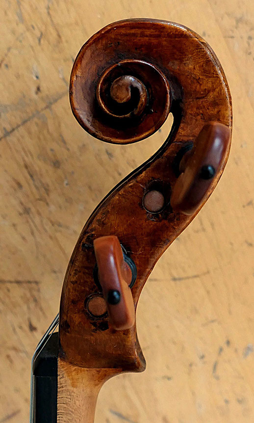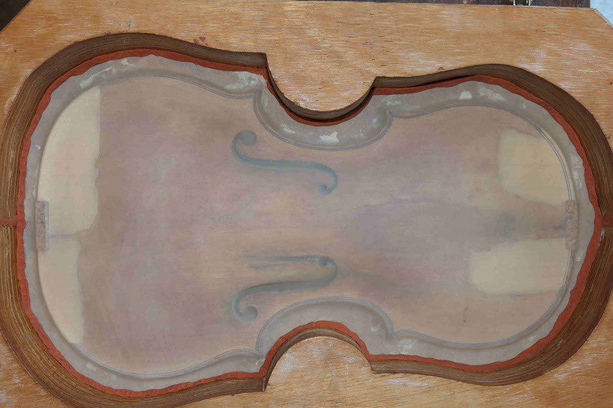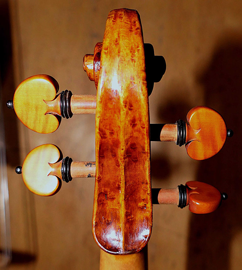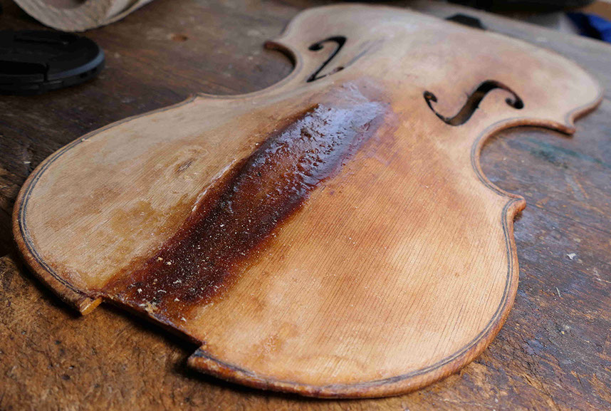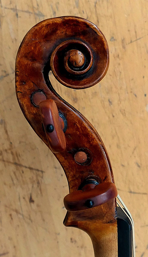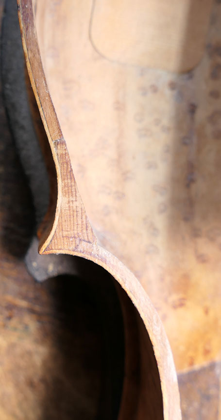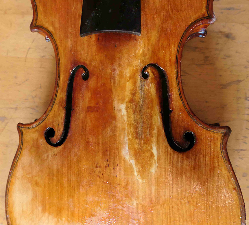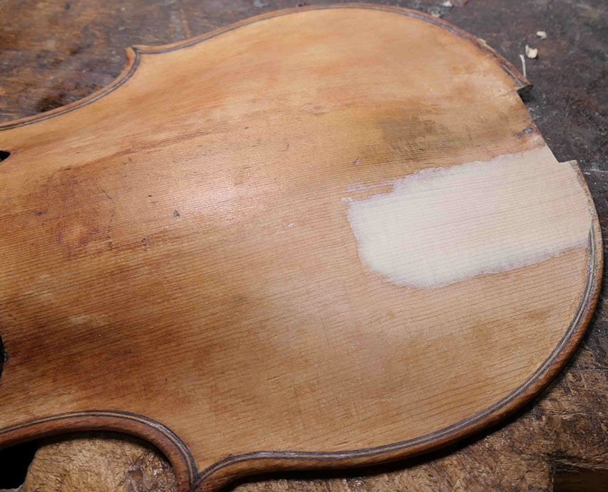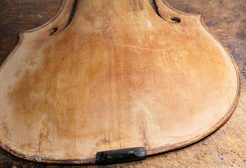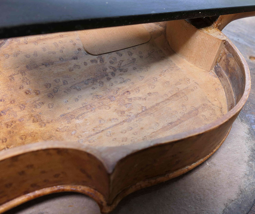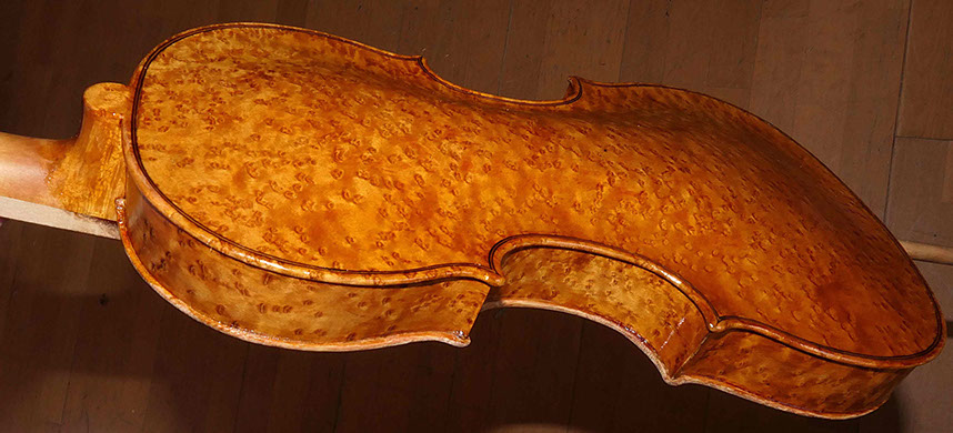Im Juli 2021 kam eine Dame zu mir in die Werkstatt, um mir eine Geige zu zeigen. Sie erzählte mir, dass sie und Ihre Geschwister vom Vater ca. 60 Instrumente geerbt haben. Ihr Vater sammelte Geigen und reparierte auch autodidaktisch Instrumente. Die Geige, welche mir gezeigt wurde, soll eines seiner wertvollsten Instrumente, eine echte Jacobus Stainer aus Absam sein, welche auch eine Expertise von einem anerkannten Gutachter und Geigenbauer hat. Als der Kasten geöffnet wurde, traute ich meinen Augen kaum, da die Geige keinen originalen Lack mehr hatte und mit einem sehr dicken immer noch klebrigen Lack überzogen war. Ich konnte es kaum glauben, dass das eine echte Stainer Geige sein sollte, aber viele einzelne Dinge deuteten darauf hin. Nachdem ich Bilder in Büchern verglichen hatte und im Internet recherchierte, hatte ich eine andere Geige von Stainer aus dem Jahr 1665 gefunden, welche 2016 versteigert wurde. Bei beiden Instrumenten verwendete Stainer für den Boden und die Zargen Vogelaugenahorn und zwar exakt aus dem gleichen Stamm. Es müssen zwei Bretter gewesen sein, die exakt übereinander gewachsen sind. Man kann dies an der identischen Maserung erkennen.