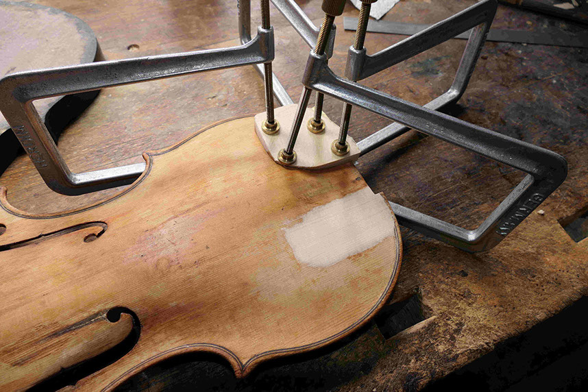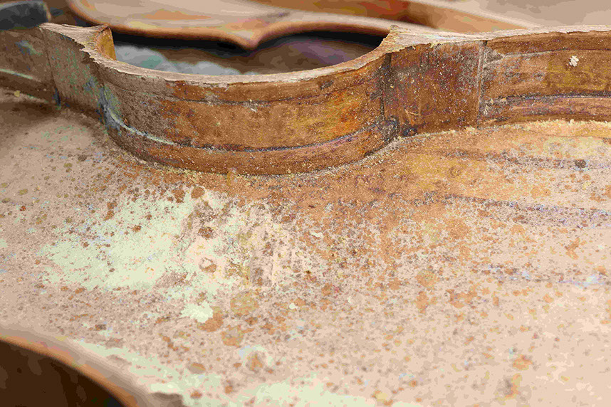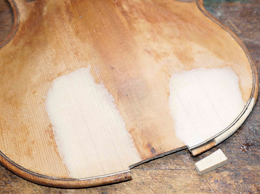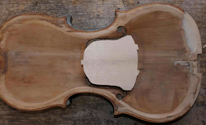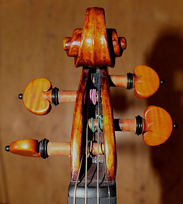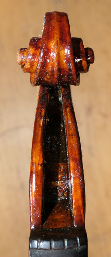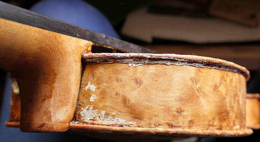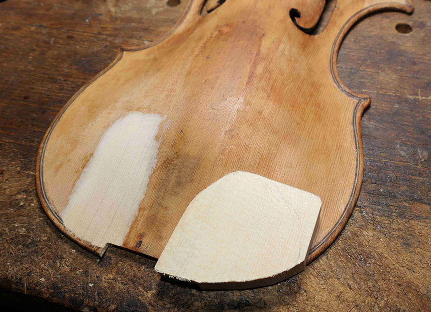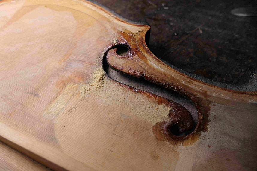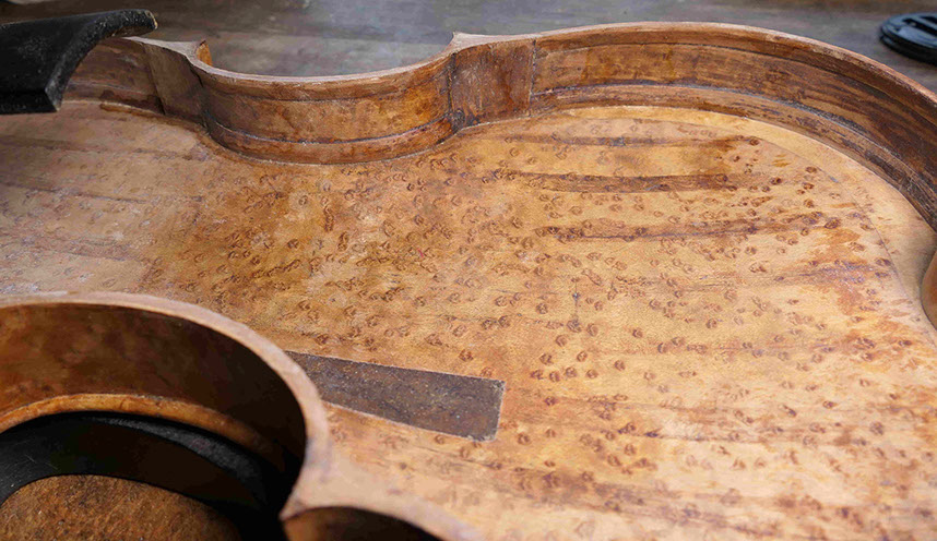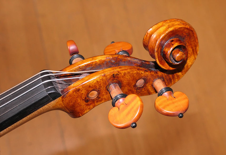 Im Juli 2021 kam eine Dame zu mir in die Werkstatt, um mir eine Geige zu zeigen. Sie erzählte mir, dass sie und Ihre Geschwister vom Vater ca. 60 Instrumente geerbt haben. Ihr Vater sammelte Geigen und reparierte auch autodidaktisch Instrumente. Die Geige, welche mir gezeigt wurde, soll eines seiner wertvollsten Instrumente, eine echte Jacobus Stainer aus Absam sein, welche auch eine Expertise von einem anerkannten Gutachter und Geigenbauer hat. Als der Kasten geöffnet wurde, traute ich meinen Augen kaum, da die Geige keinen originalen Lack mehr hatte und mit einem sehr dicken immer noch klebrigen Lack überzogen war. Ich konnte es kaum glauben, dass das eine echte Stainer Geige sein sollte, aber viele einzelne Dinge deuteten darauf hin. Nachdem ich Bilder in Büchern verglichen hatte und im Internet recherchierte, hatte ich eine andere Geige von Stainer aus dem Jahr 1665 gefunden, welche 2016 versteigert wurde. Bei beiden Instrumenten verwendete Stainer für den Boden und die Zargen Vogelaugenahorn und zwar exakt aus dem gleichen Stamm. Es müssen zwei Bretter gewesen sein, die exakt übereinander gewachsen sind. Man kann dies an der identischen Maserung erkennen.