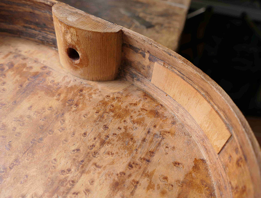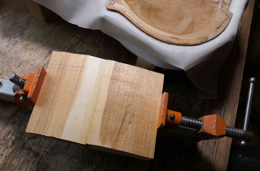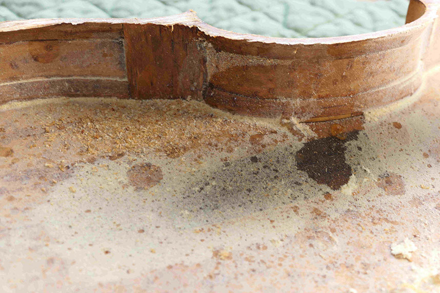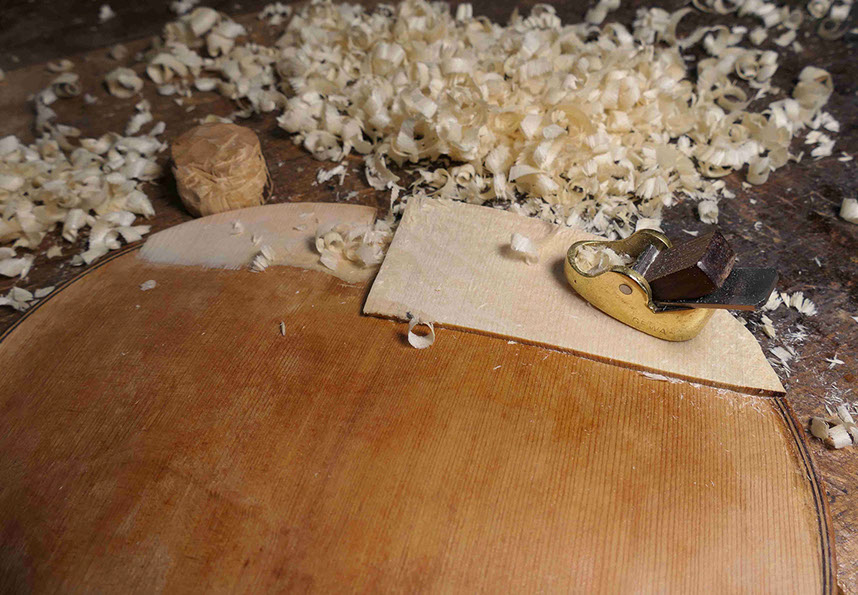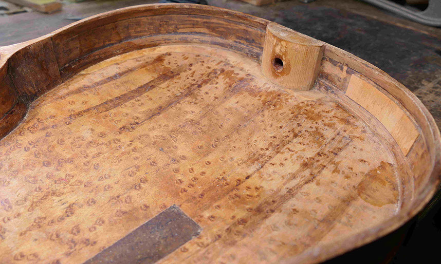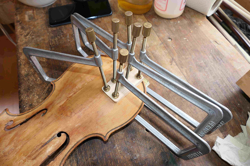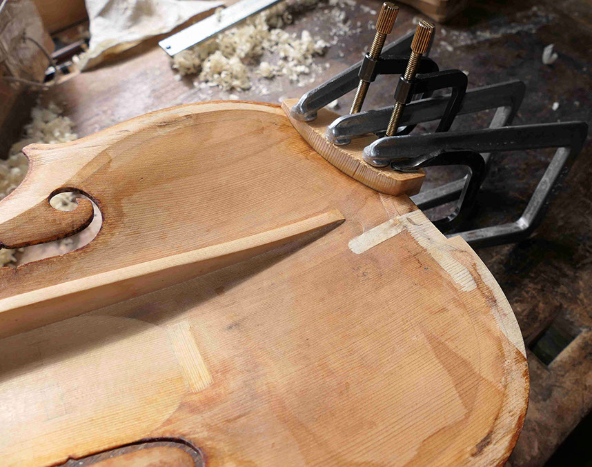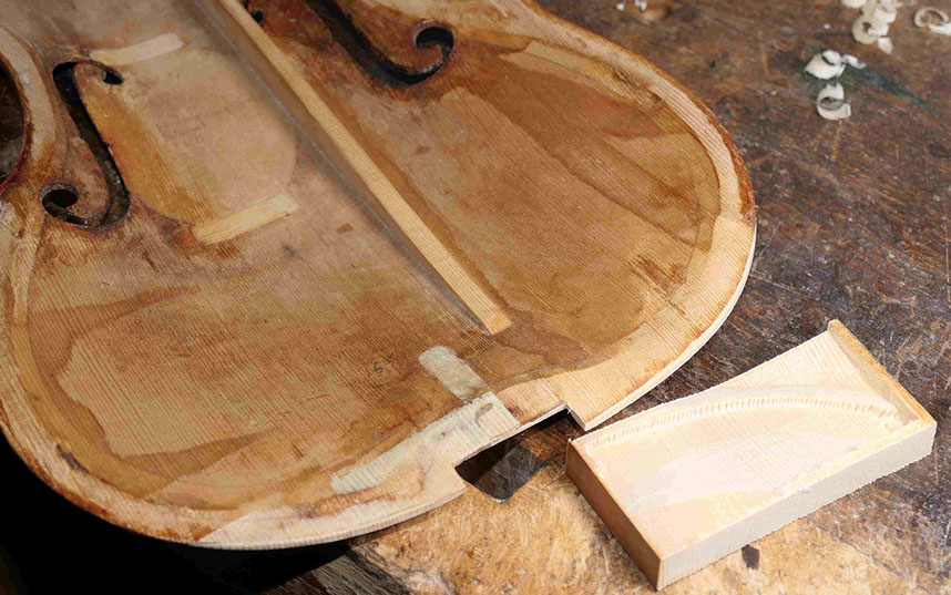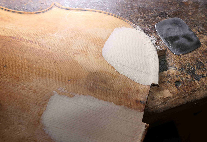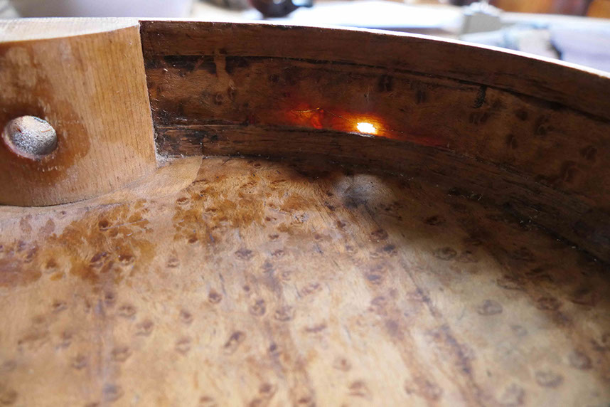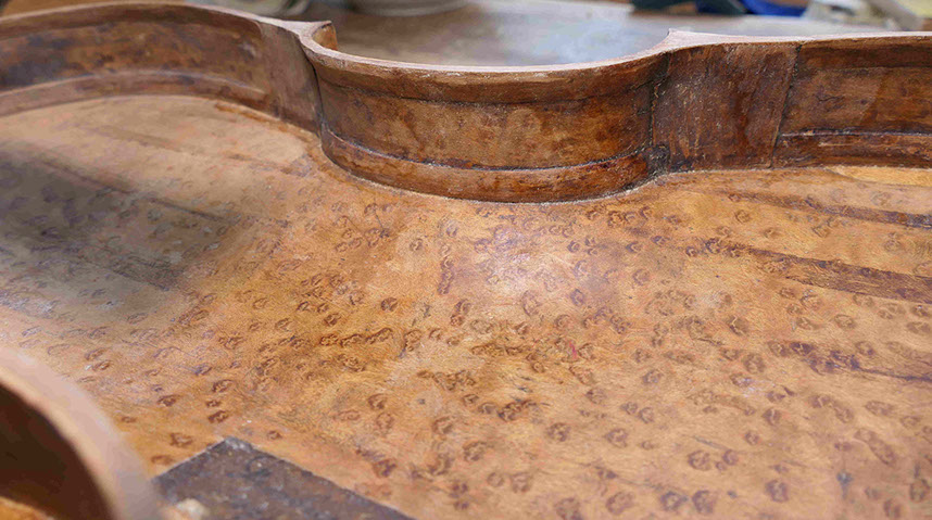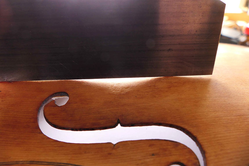 Im Juli 2021 kam eine Dame zu mir in die Werkstatt, um mir eine Geige zu zeigen. Sie erzählte mir, dass sie und Ihre Geschwister vom Vater ca. 60 Instrumente geerbt haben. Ihr Vater sammelte Geigen und reparierte auch autodidaktisch Instrumente. Die Geige, welche mir gezeigt wurde, soll eines seiner wertvollsten Instrumente, eine echte Jacobus Stainer aus Absam sein, welche auch eine Expertise von einem anerkannten Gutachter und Geigenbauer hat. Als der Kasten geöffnet wurde, traute ich meinen Augen kaum, da die Geige keinen originalen Lack mehr hatte und mit einem sehr dicken immer noch klebrigen Lack überzogen war. Ich konnte es kaum glauben, dass das eine echte Stainer Geige sein sollte, aber viele einzelne Dinge deuteten darauf hin. Nachdem ich Bilder in Büchern verglichen hatte und im Internet recherchierte, hatte ich eine andere Geige von Stainer aus dem Jahr 1665 gefunden, welche 2016 versteigert wurde. Bei beiden Instrumenten verwendete Stainer für den Boden und die Zargen Vogelaugenahorn und zwar exakt aus dem gleichen Stamm. Es müssen zwei Bretter gewesen sein, die exakt übereinander gewachsen sind. Man kann dies an der identischen Maserung erkennen.