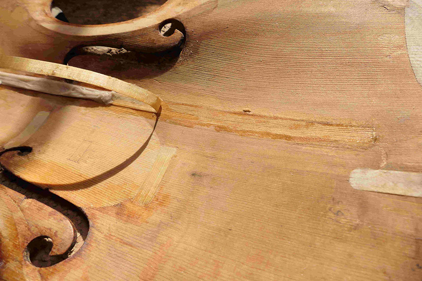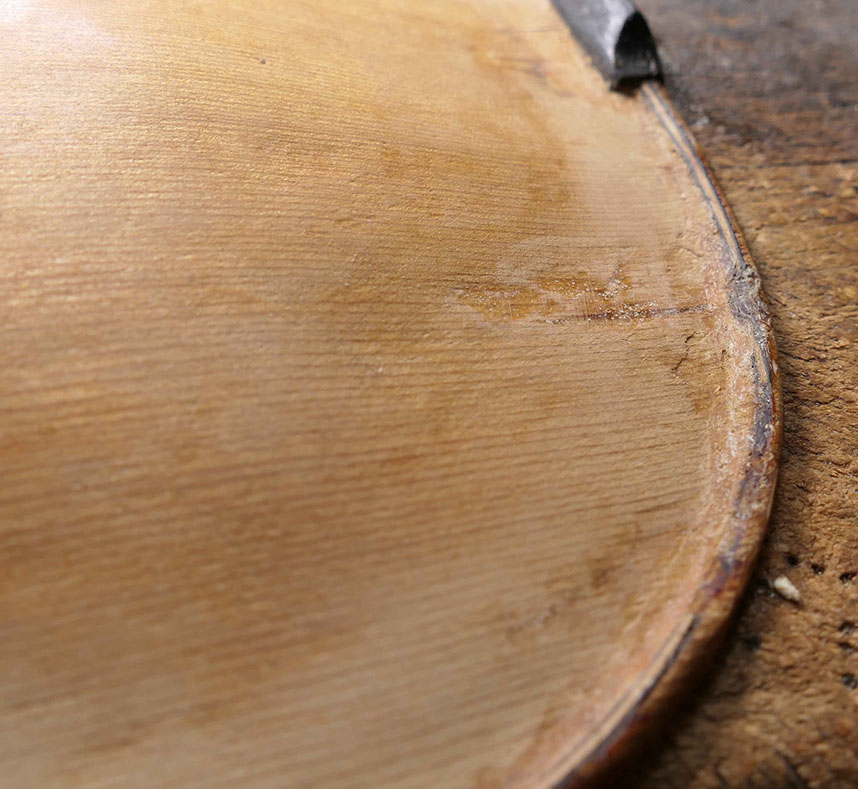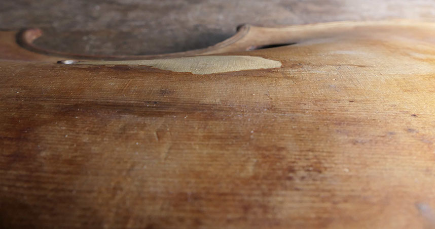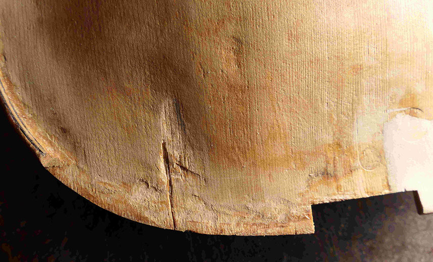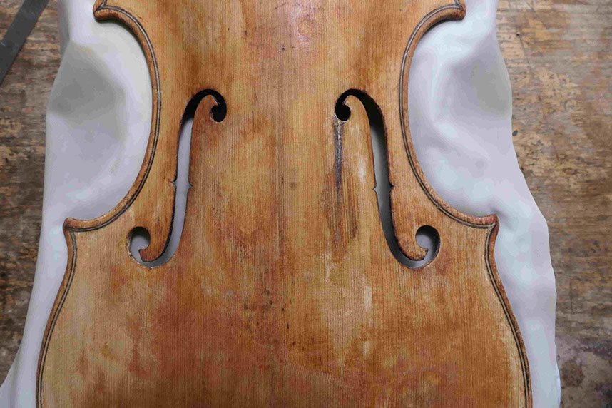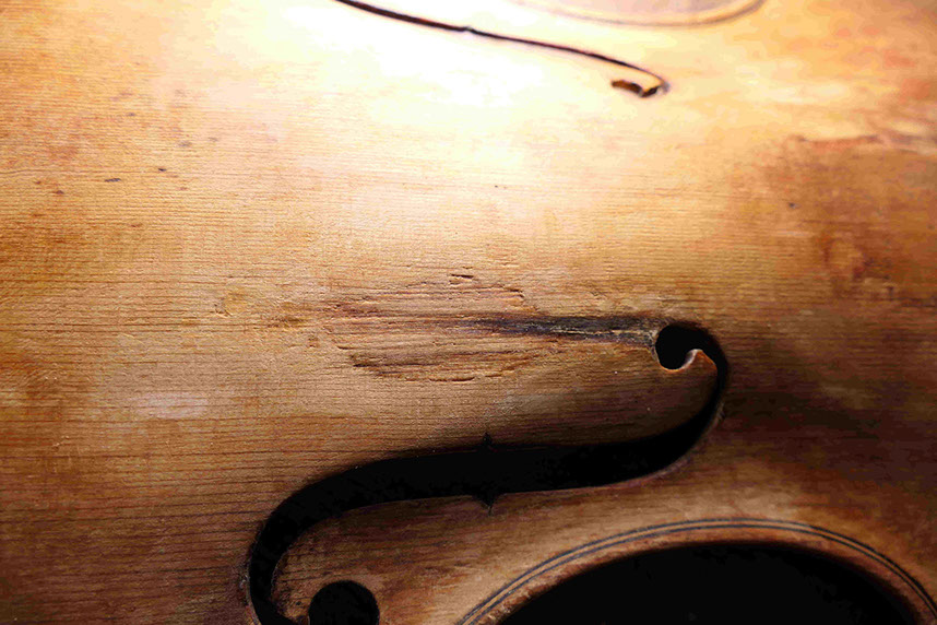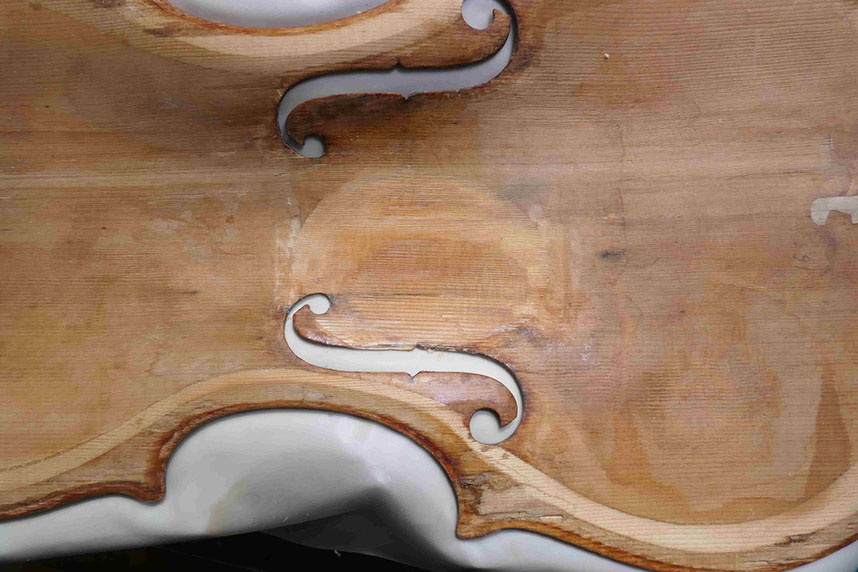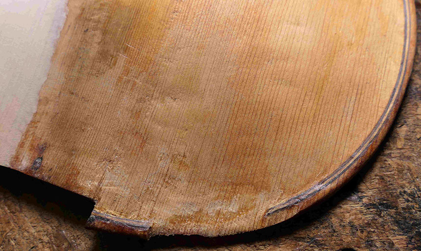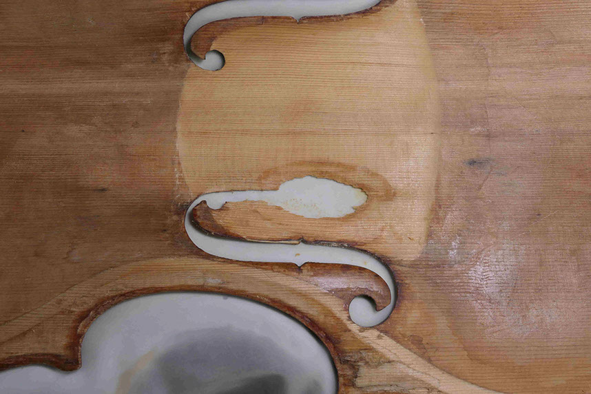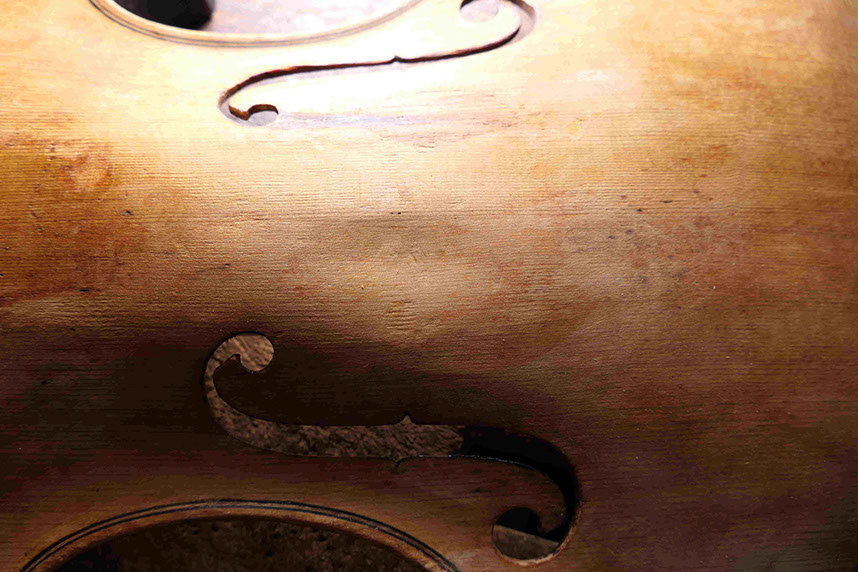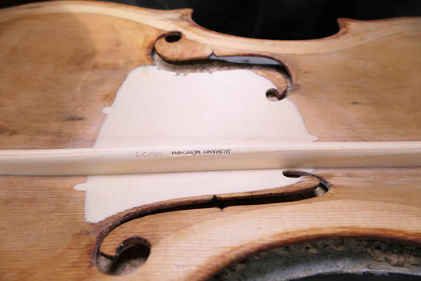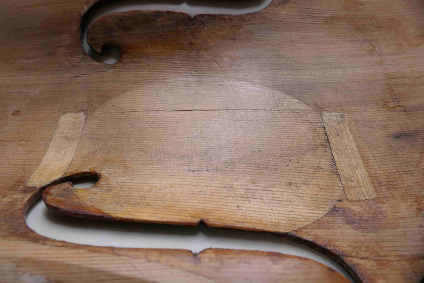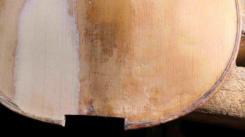 Die Vogelaugen (Ästchen) sind exakt an der gleichen Stelle; bei der Geige im linken Bild sind die Augen nur ein kleines bisschen kleiner. Der Dendrochronologe Arjan Versteeg aus Schäftlarn hat die Decke im August 2021 vermessen und als ältesten Jahresring 1408 ermittelt. Der jüngste Jahresring wird mit 1529 angegeben. Wenn man nun die Jahre der Lagerung des Holzes und das Verlorengehen der Jahre durch das Fugen der zwei Deckenhälften dazurechnet, kann man davon ausgehen, dass die Violine nach 1534 gebaut wurde. Herr Versteeg hatte vorher schon eine zweite Violine von Jacobus Stainer aus dem Jahr 1672 vermessen und die Daten archiviert.