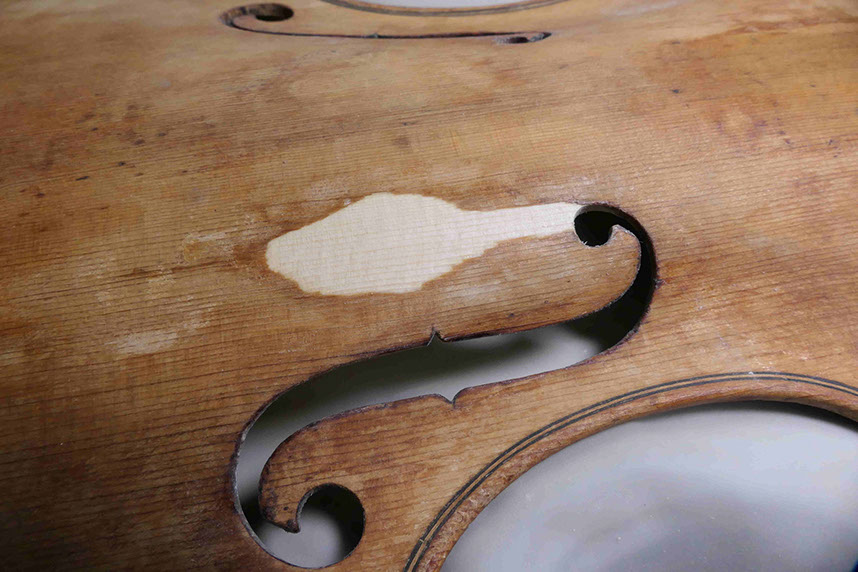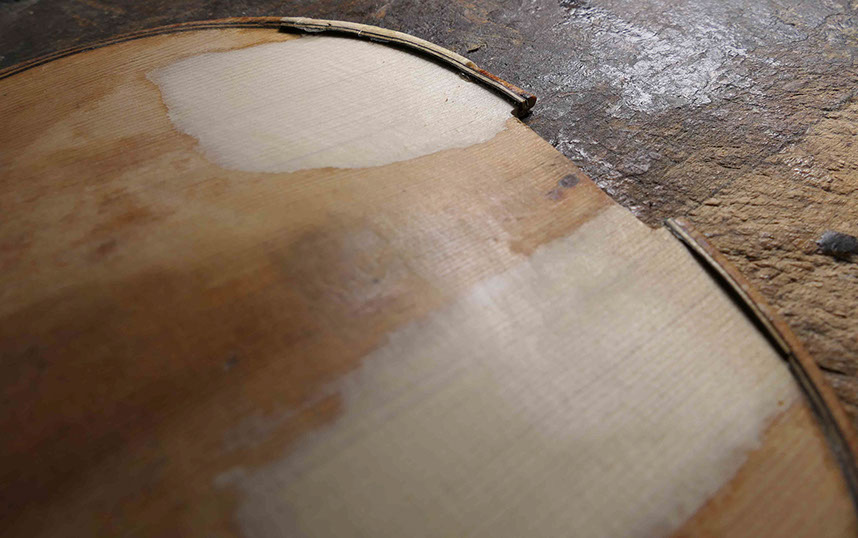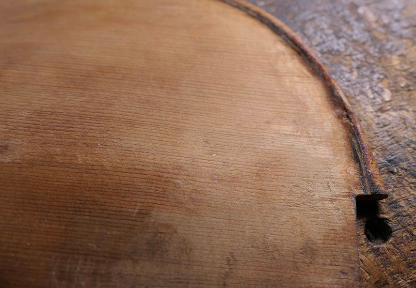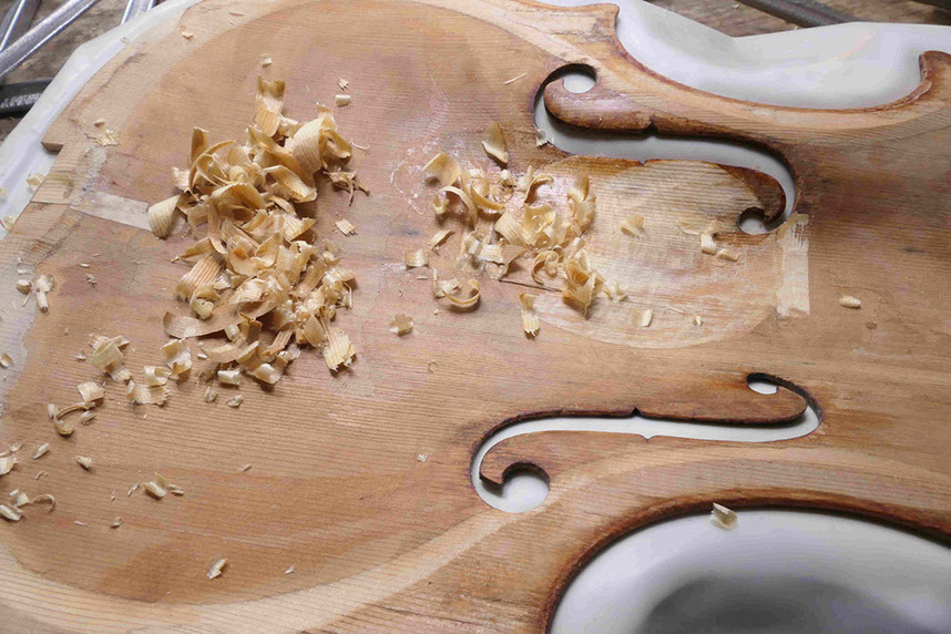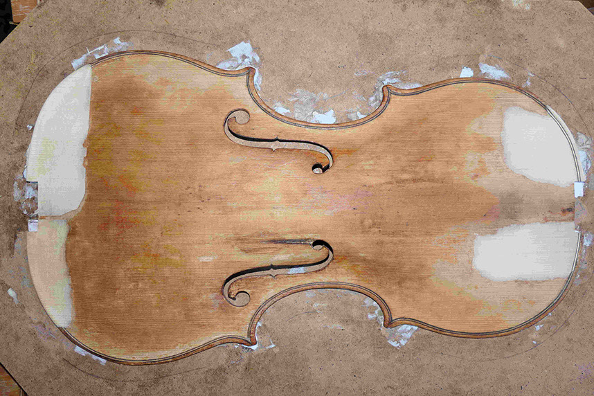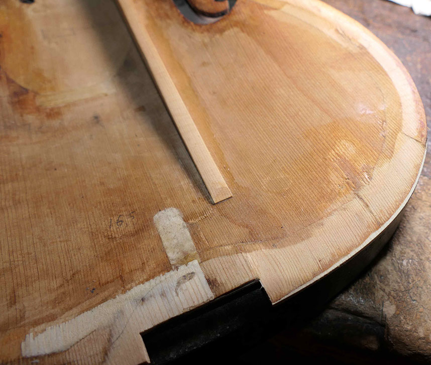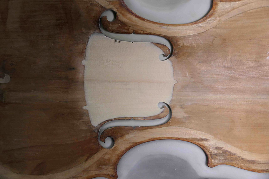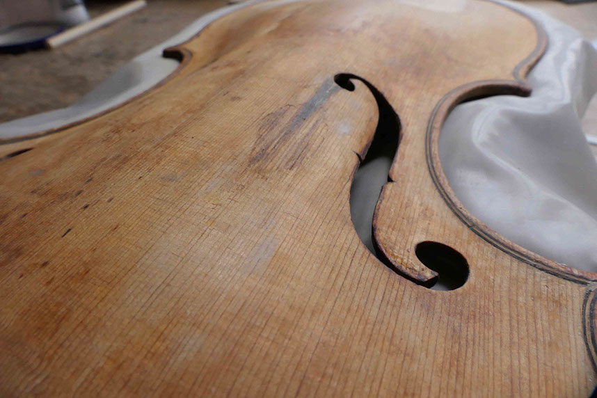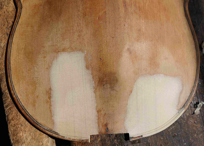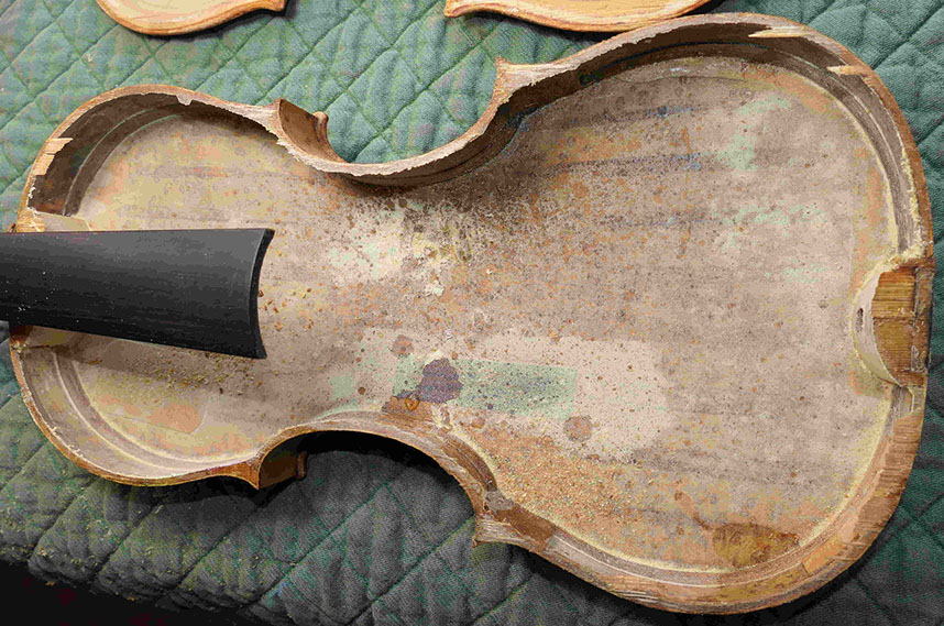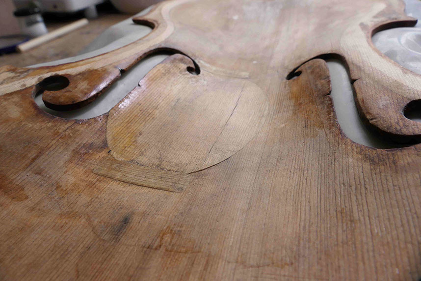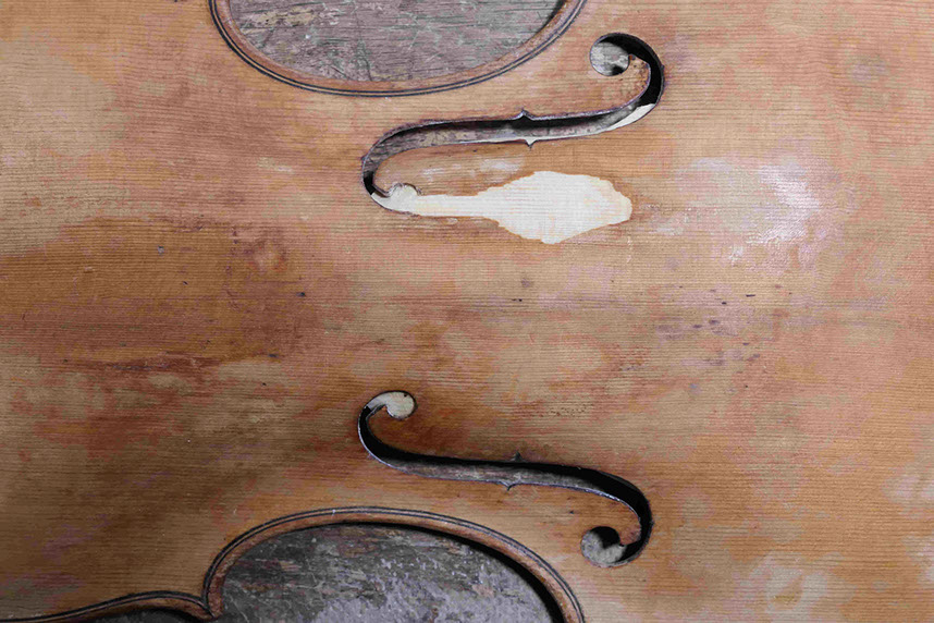 Die Vogelaugen (Ästchen) sind exakt an der gleichen Stelle; bei der Geige im linken Bild sind die Augen nur ein kleines bisschen kleiner. Der Dendrochronologe Arjan Versteeg aus Schäftlarn hat die Decke im August 2021 vermessen und als ältesten Jahresring 1408 ermittelt. Der jüngste Jahresring wird mit 1529 angegeben. Wenn man nun die Jahre der Lagerung des Holzes und das Verlorengehen der Jahre durch das Fugen der zwei Deckenhälften dazurechnet, kann man davon ausgehen, dass die Violine nach 1534 gebaut wurde. Herr Versteeg hatte vorher schon eine zweite Violine von Jacobus Stainer aus dem Jahr 1672 vermessen und die Daten archiviert.