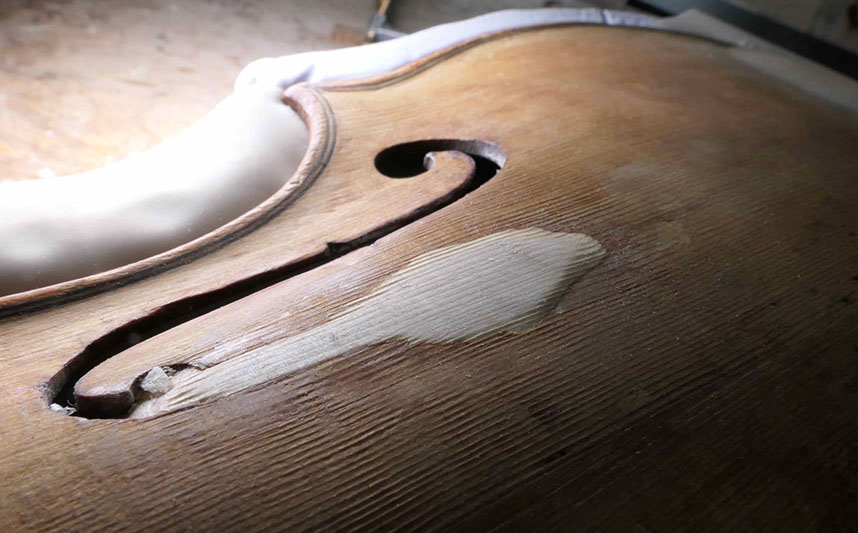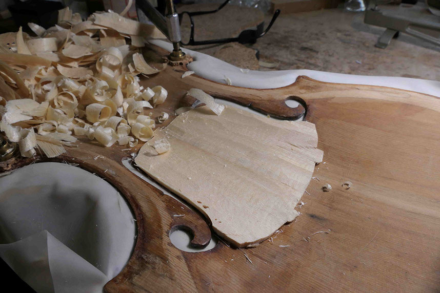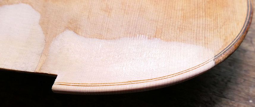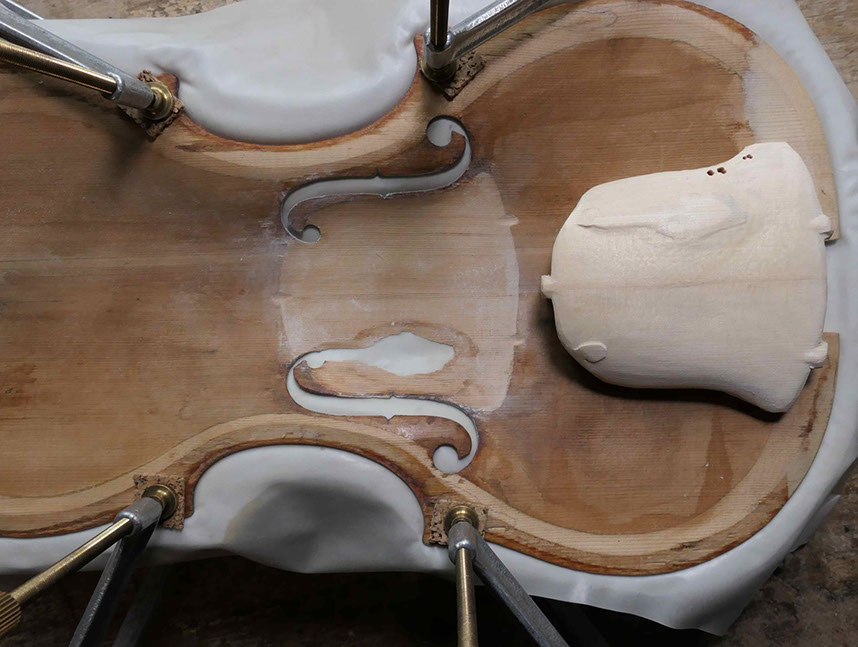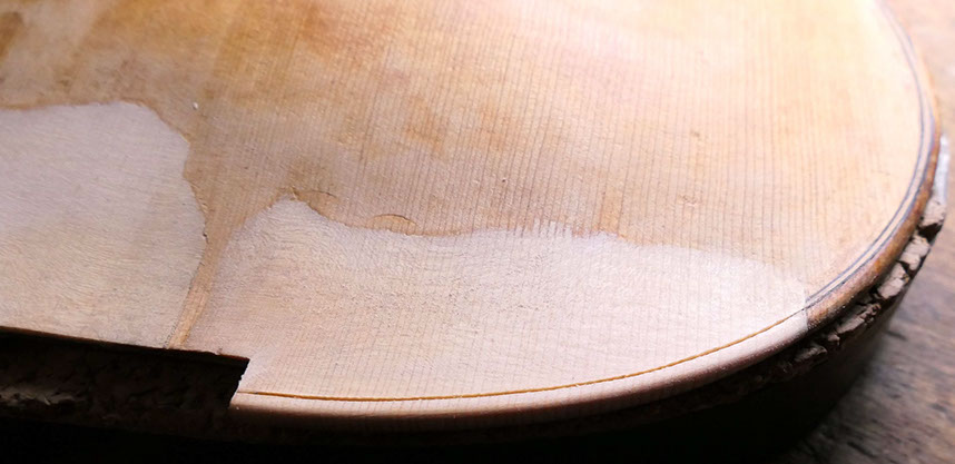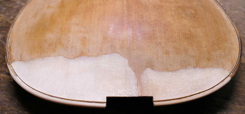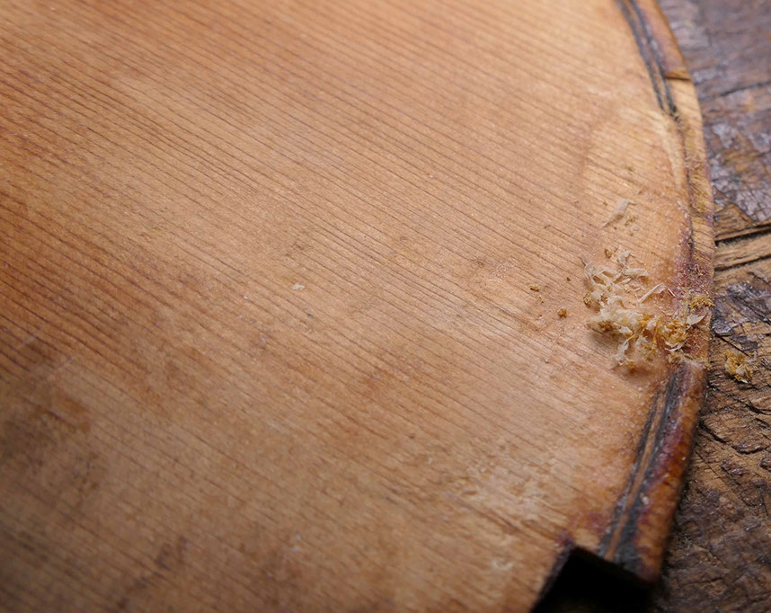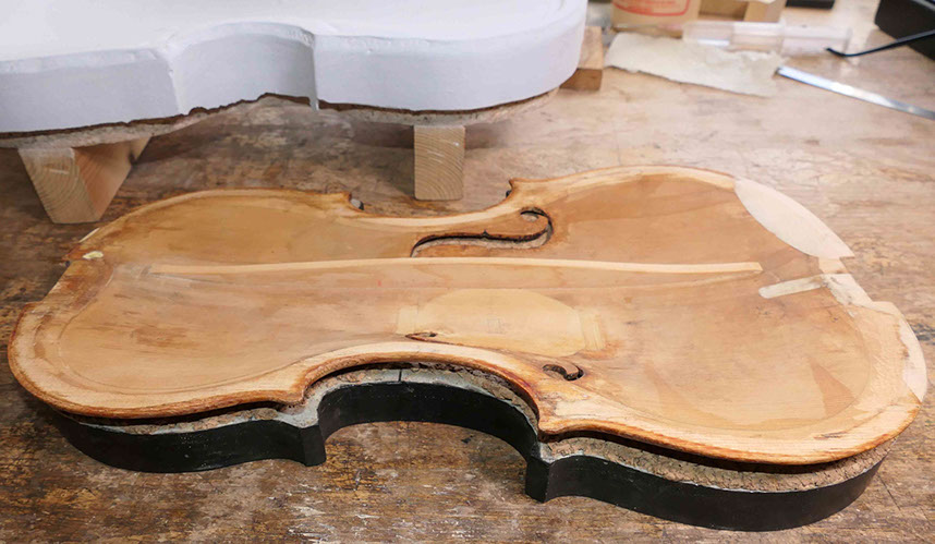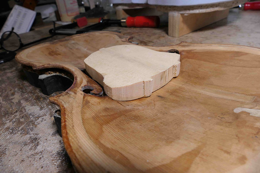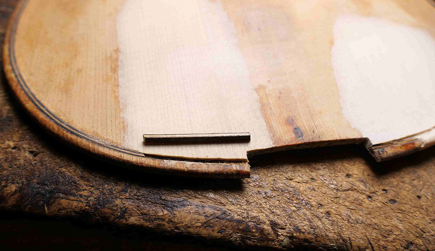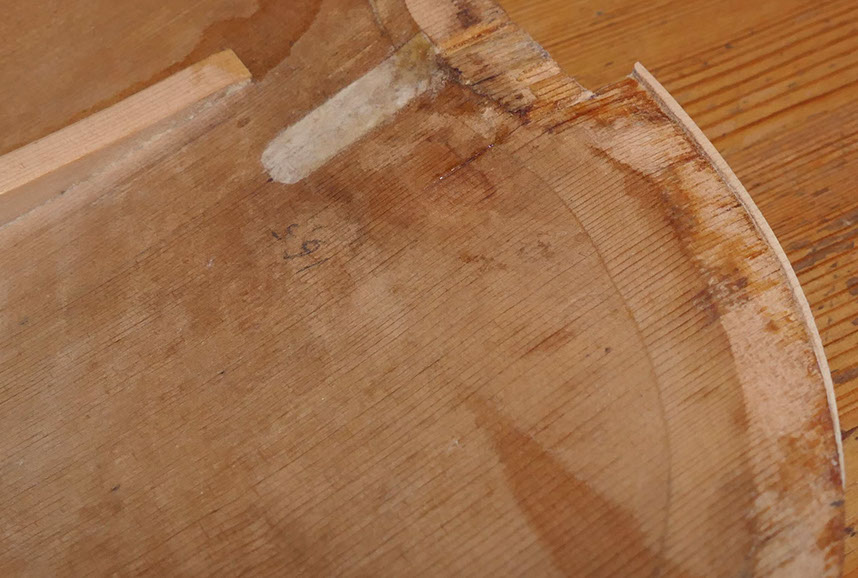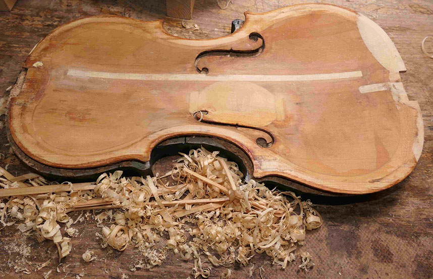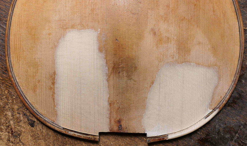 Die Vogelaugen (Ästchen) sind exakt an der gleichen Stelle; bei der Geige im linken Bild sind die Augen nur ein kleines bisschen kleiner. Der Dendrochronologe Arjan Versteeg aus Schäftlarn hat die Decke im August 2021 vermessen und als ältesten Jahresring 1408 ermittelt. Der jüngste Jahresring wird mit 1529 angegeben. Wenn man nun die Jahre der Lagerung des Holzes und das Verlorengehen der Jahre durch das Fugen der zwei Deckenhälften dazurechnet, kann man davon ausgehen, dass die Violine nach 1534 gebaut wurde. Herr Versteeg hatte vorher schon eine zweite Violine von Jacobus Stainer aus dem Jahr 1672 vermessen und die Daten archiviert.