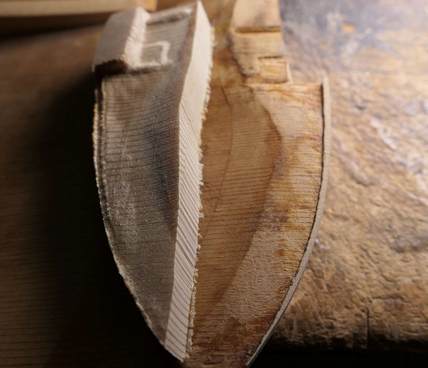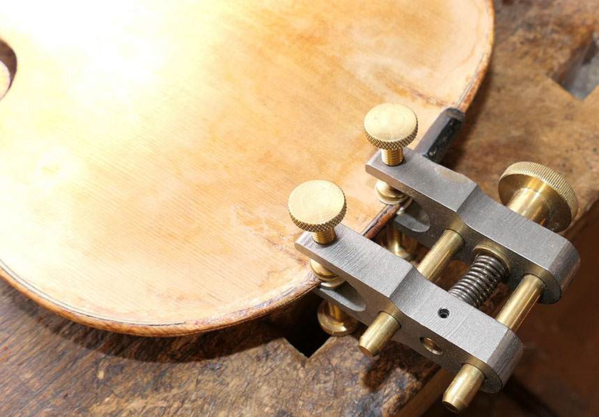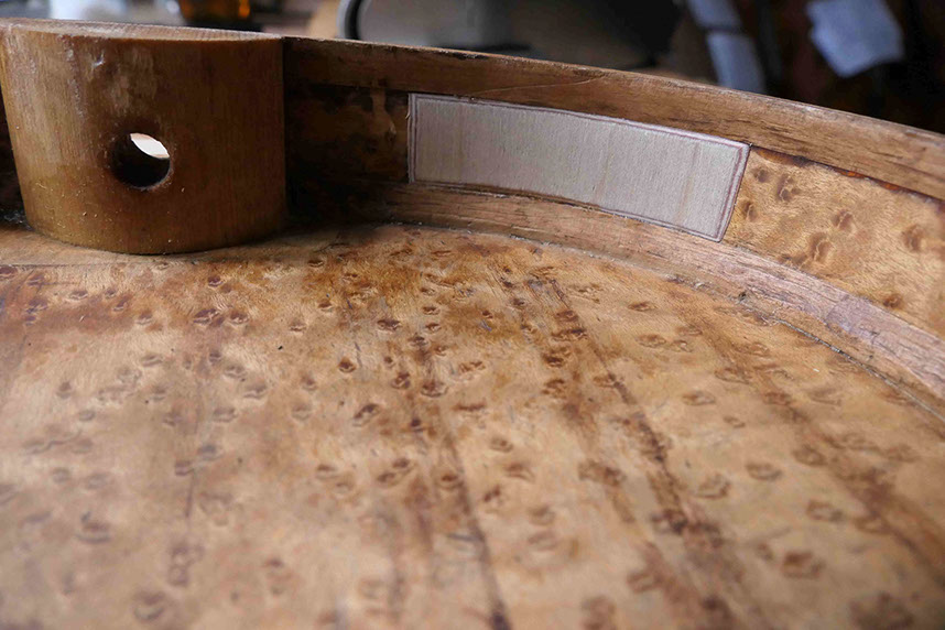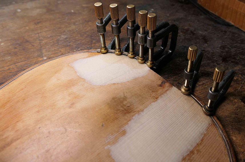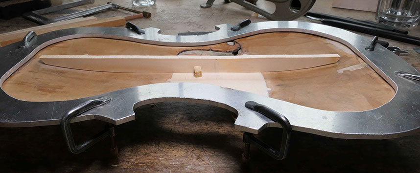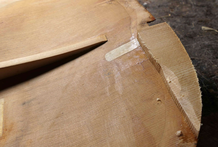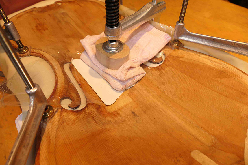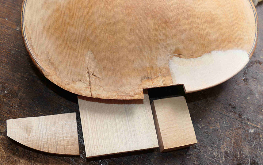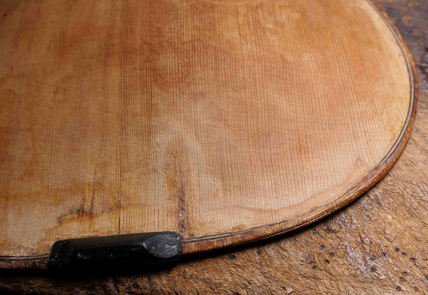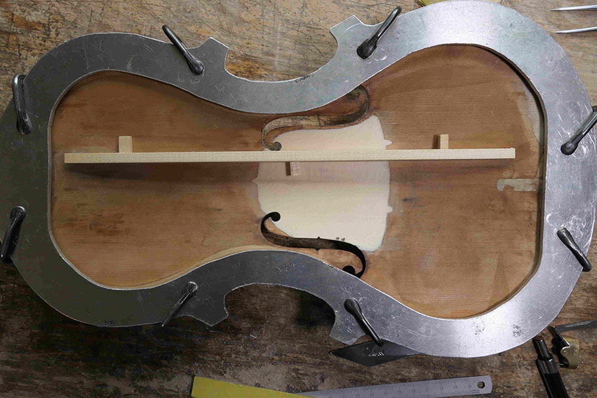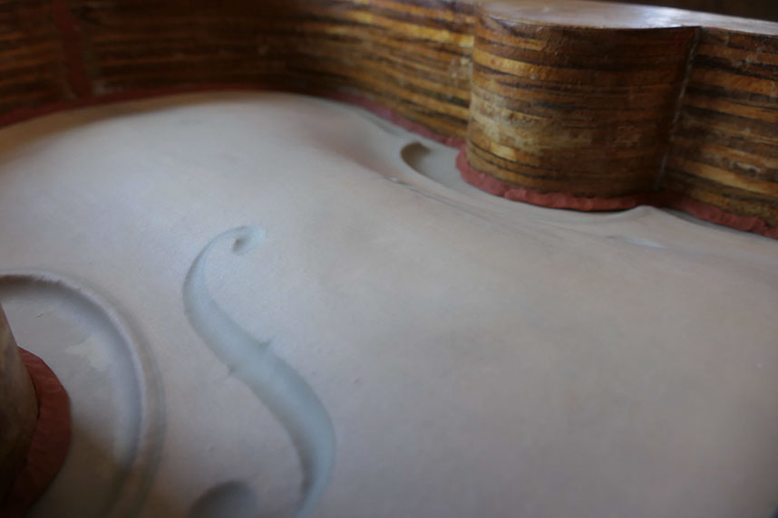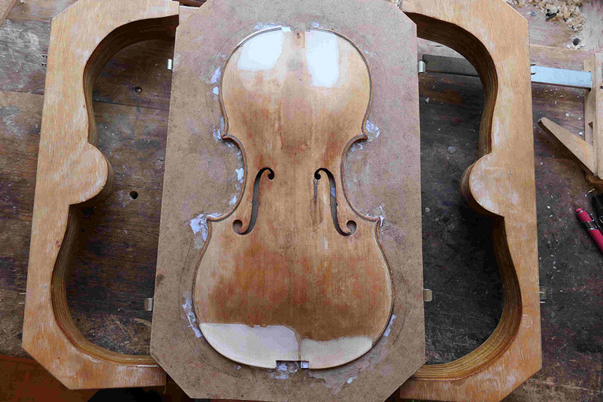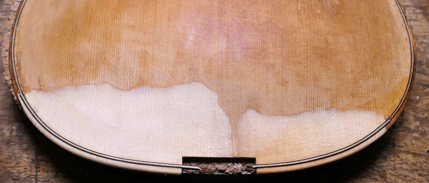 Die Vogelaugen (Ästchen) sind exakt an der gleichen Stelle; bei der Geige im linken Bild sind die Augen nur ein kleines bisschen kleiner. Der Dendrochronologe Arjan Versteeg aus Schäftlarn hat die Decke im August 2021 vermessen und als ältesten Jahresring 1408 ermittelt. Der jüngste Jahresring wird mit 1529 angegeben. Wenn man nun die Jahre der Lagerung des Holzes und das Verlorengehen der Jahre durch das Fugen der zwei Deckenhälften dazurechnet, kann man davon ausgehen, dass die Violine nach 1534 gebaut wurde. Herr Versteeg hatte vorher schon eine zweite Violine von Jacobus Stainer aus dem Jahr 1672 vermessen und die Daten archiviert.